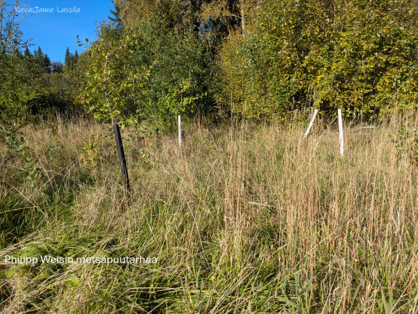 Philipp onkin alkanut suosimaan toista metodia, jossa aletaan rakentaa metsäpuutarhaa metsästä käsin harventamalla. Vesimyyrä ei metsässä viihdy, joten tehdään metsään aukkopaikkoja, jonne hetimiten istutetaan halutut puut ja pensaat. Toki nämäkin pitää suojata runkoa syöviltä jyrsijöiltä.