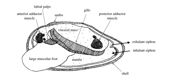 Bild: Dammusslans anatomi. Källa: Ellis, A.E., 1978. British freshwater bivalve mollusca: Keys and notes for the identification of the species. London: Academic Press.