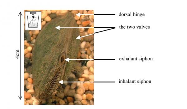 Bild: Dammusslorna filtrerar, bilden visar de öppna in- och utströmningsrören. Källa: Ellis, A.E., 1978. British freshwater bivalve mollusca: Keys and notes for the identification of the species. London: Academic Press.